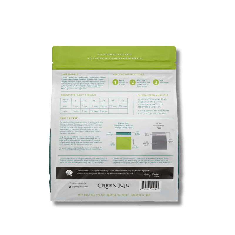 Chicken & Sardine offers a gently warming, protein-rich option that supports energy and resilience. Chicken provides easily available nutrition for pets that need a little extra pep, while whole sardines offer omega-3s to support skin, joints, and brain health. Blended with a diverse mix of antioxidant-rich plants, this recipe helps fuel vitality while keeping the bowl balanced and nourishing.